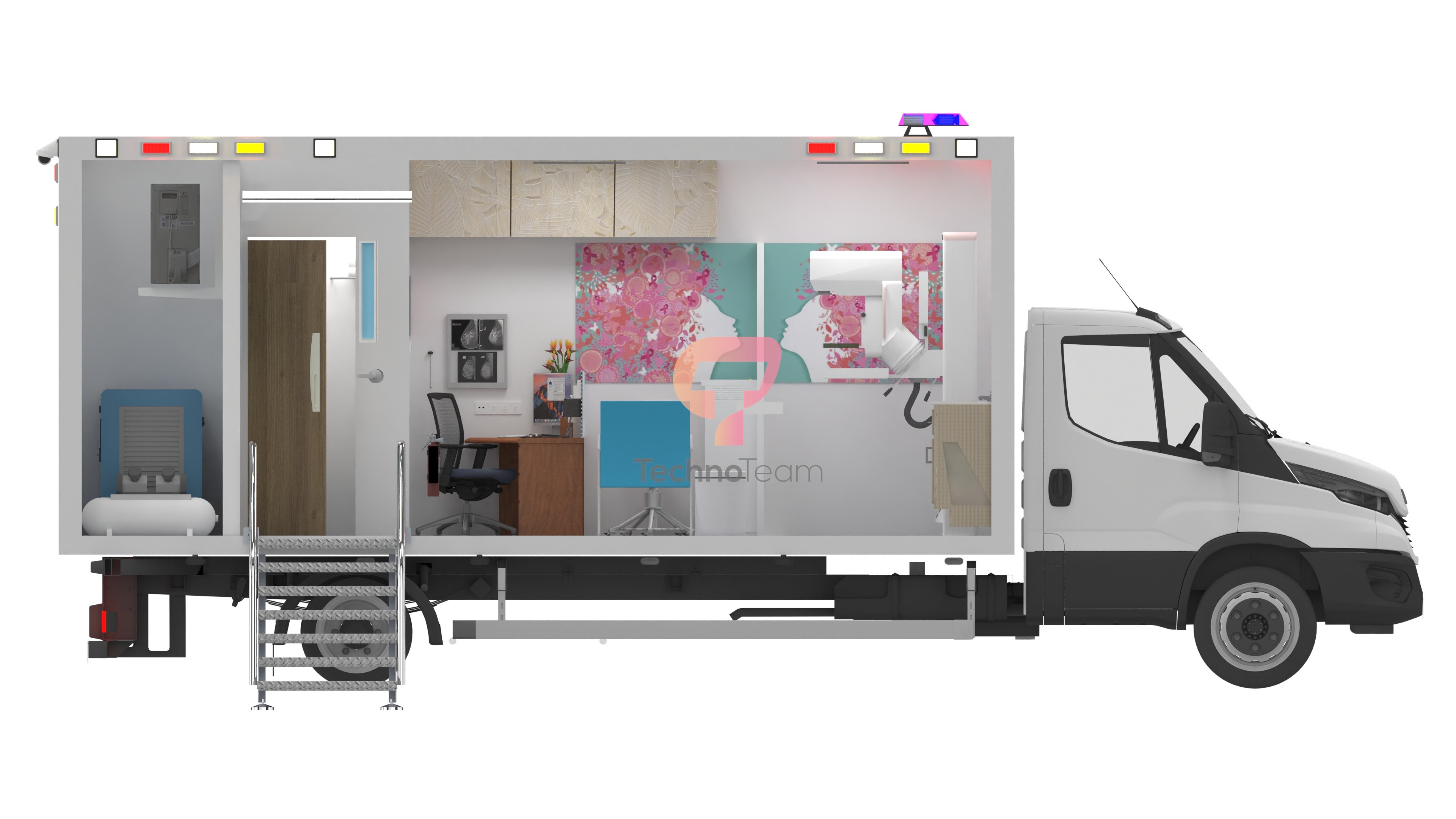 Techno Team bağımsız çalışabilen, geniş ve konforlu, donanımlı Kamyon (Araç) Üstü Mobil Mamografi Konteynerleri tasarlamaktadır